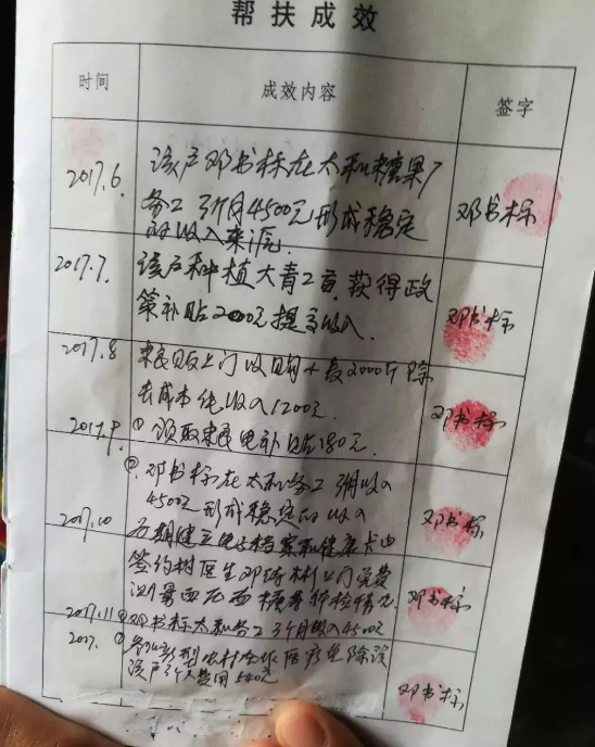 当邓书标的妻子问及这扶贫手册上的东西呢?是谁签的字?村干部邓启民说这是应付上面检查的!